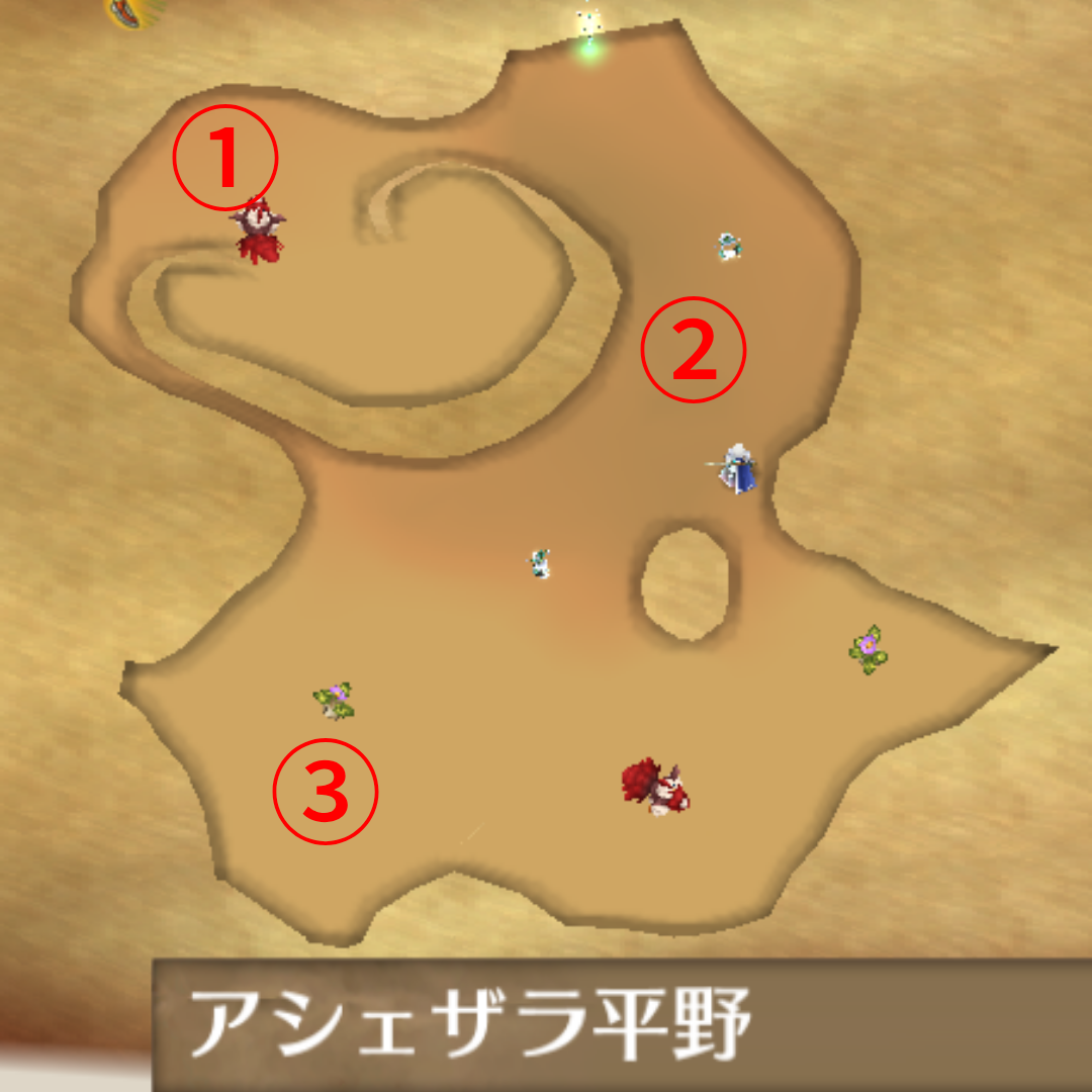 ①にはフィールドボスがいて、巻き込まないように注意が必要です。もう一箇所でもかれるのですが、他のモンスターが混ざって狩りにくいのでこちらにしてます。