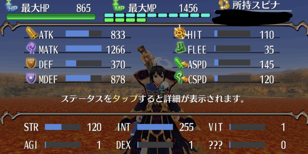 レベル99まで上げて、INT極、残りSTRに降った形となります。あんかけチャーハンレベル9でMP盛ってます。
